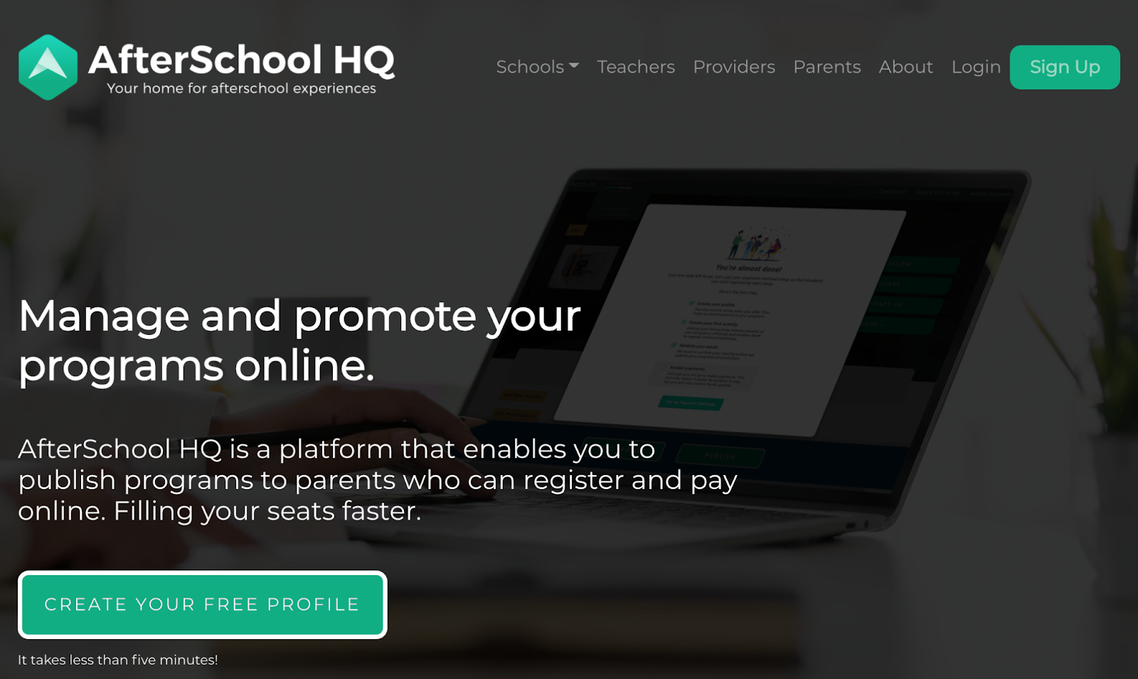 Afterschool HQ’s web site options two CTAs above the fold, each geared towards program administrators who’re taken with selling their after-school applications to households on the positioning. The observe beneath the longer CTA “Create Your Free Profile” provides guests the nudge they should create an account — step one to changing into an Afterschool HQ supplier.
