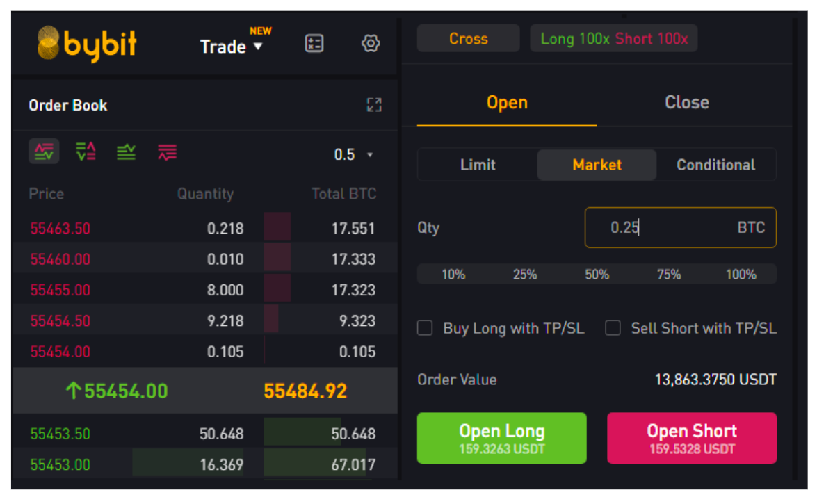The above image exhibits that Bybit USDT futures order entry requires a BTC-denominated amount and the identical process takes place at Binance. Then again, OKEx and FTX supply customers a better choice which permits the consumer to enter a USDT amount, whereas robotically changing to BTC phrases.