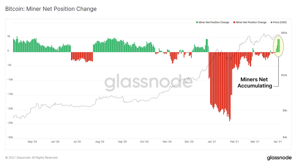 By holding again on promoting Bitcoin, they turn into web accumulators. That is expressed within the miner web place change metric, which reveals the 30-day change of the provision held in miner addresses.