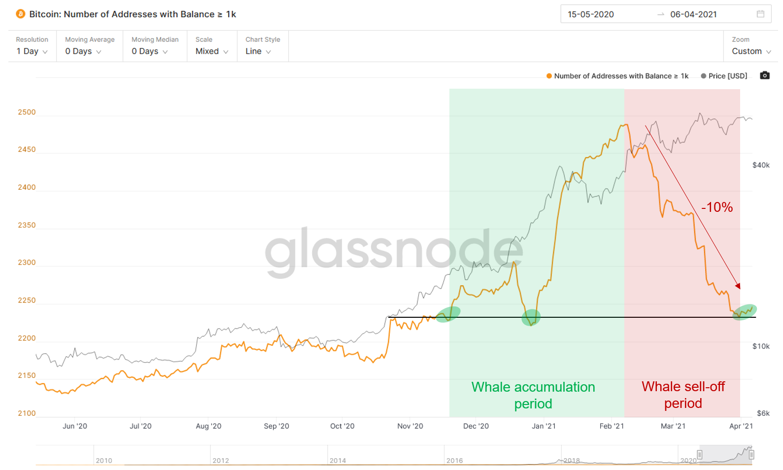 If rebalancing is the most important driver, and contemplating that the variety of addresses holding equal to or greater than 1,000 BTC is again at ranges final seen on the finish of 2020 — when the worth began rising — whales may very well be completed promoting for now.