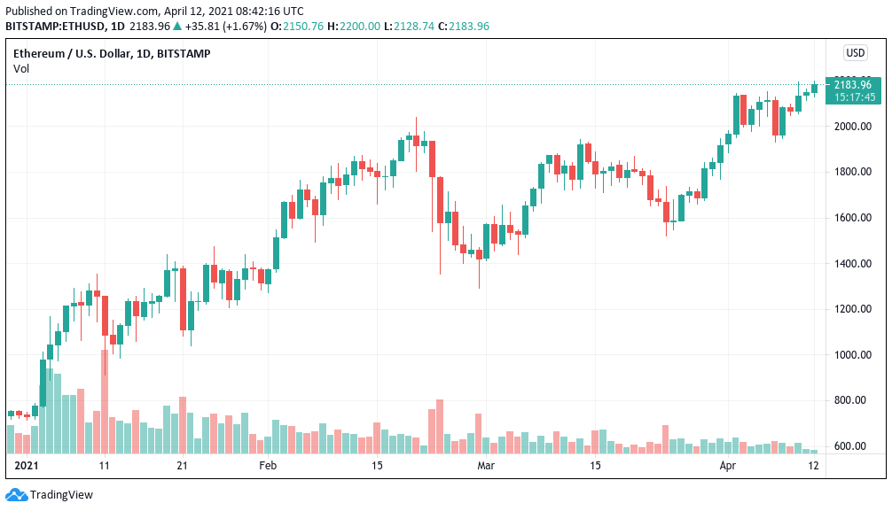 These are being led by Ether (ETH), the biggest altcoin by market cap, which has hit new all-time highs on the day, at present at $2,190.