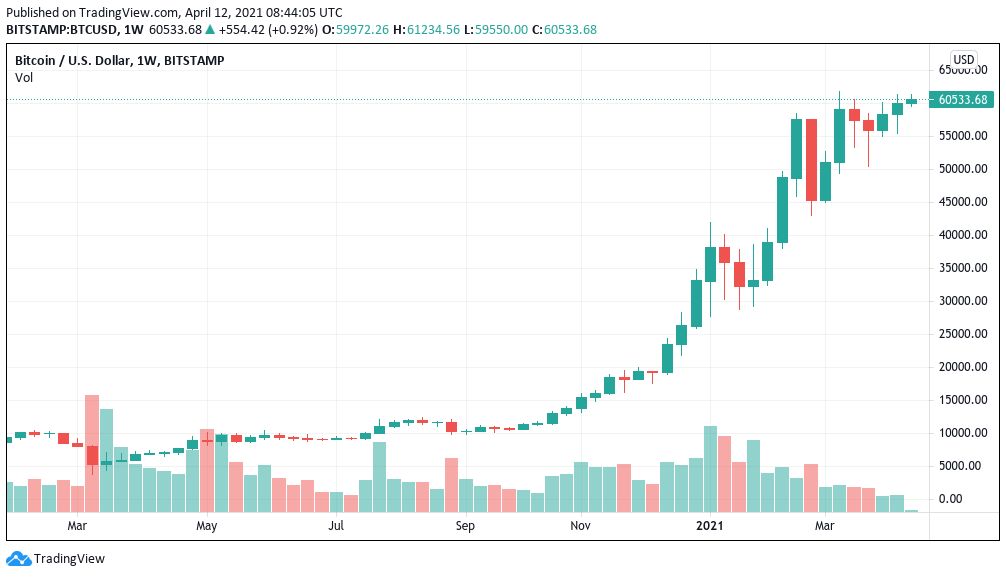 The weekend noticed the biggest weekly shut in Bitcoin’s historical past at round $60,000.
