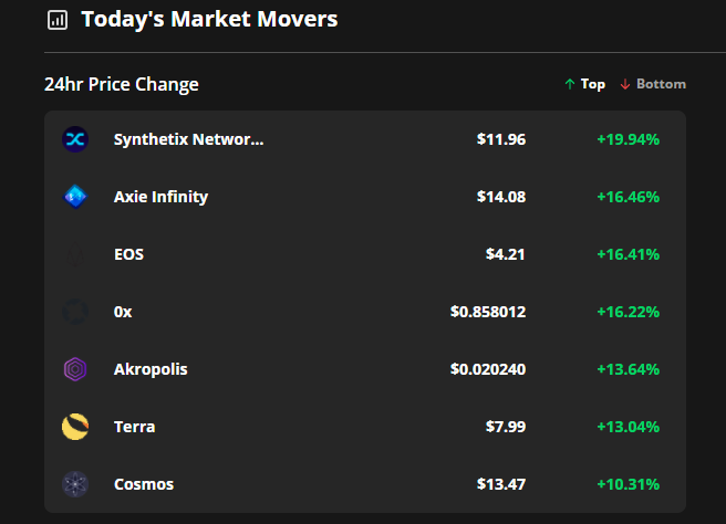 Information from Cointelegraph Markets Professional and TradingView exhibits that the highest 3 movers over the previous 24 hours are Synthetix (SNX), Axie Infinity (AXS) and EOS.