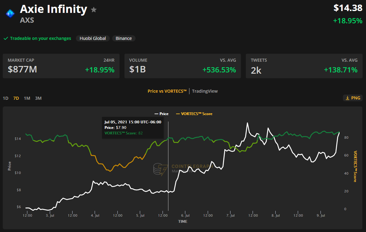 VORTECS™ information from Cointelegraph Markets Professional started to detect a bullish outlook for AXS on July 5, previous to the current value rise.