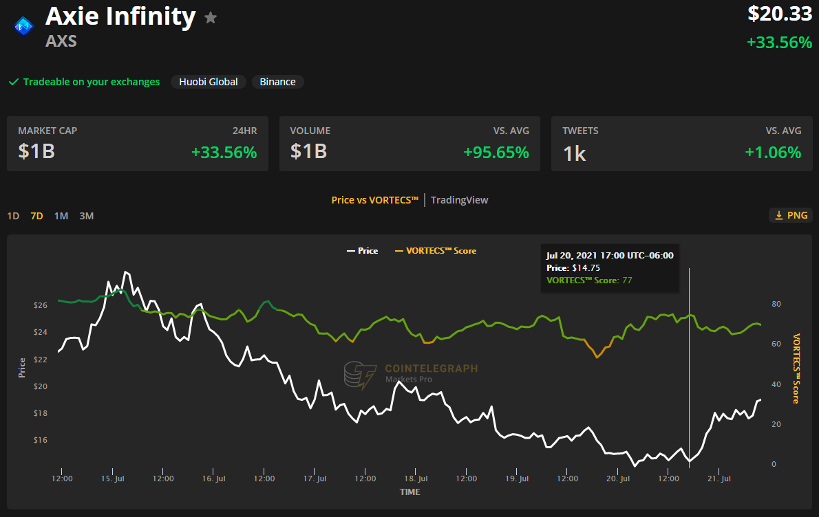As seen within the chart above VORTECS™ Rating for AXS has been elevated for almost all of the previous week and reached a excessive of 77 on July 20, round one hour earlier than the worth elevated 46% over the following sixteen hours. At the moment, AXS worth trades at $18.