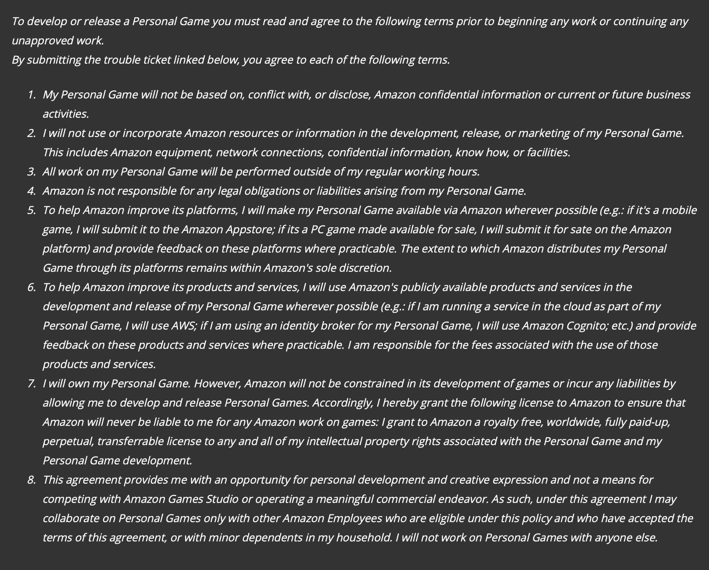 Coverage quantity seven states, “I grant to Amazon a royalty-free, worldwide, absolutely paid-up, perpetual, transferrable license to any and all of my mental property rights related to the Private Recreation and my Private Recreation improvement.” So, in different phrases, staff engaged on an impartial recreation undertaking have been required to show their IP over to Amazon free and clear.