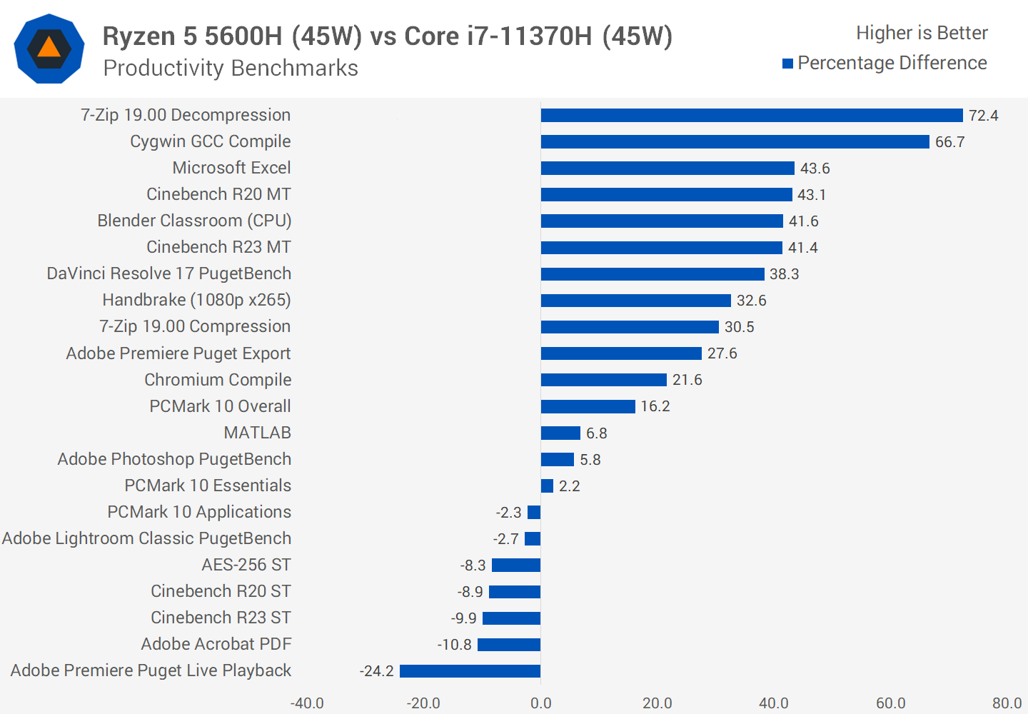 face to face comparisons it’s clear that the Ryzen 5 5600H is offering a good gen-on-gen efficiency enhance over AMD’s prior six-core CPU, the Ryzen 5 4600H. That is within the ballpark of what we noticed beforehand evaluating the 5800H to the 4800H, if a bit higher in some functions. Typically we’re seeing a modest 5 to fifteen p.c acquire in multi-threaded workloads, whereas single-threaded good points are fairly spectacular, within the 20% area or extra.