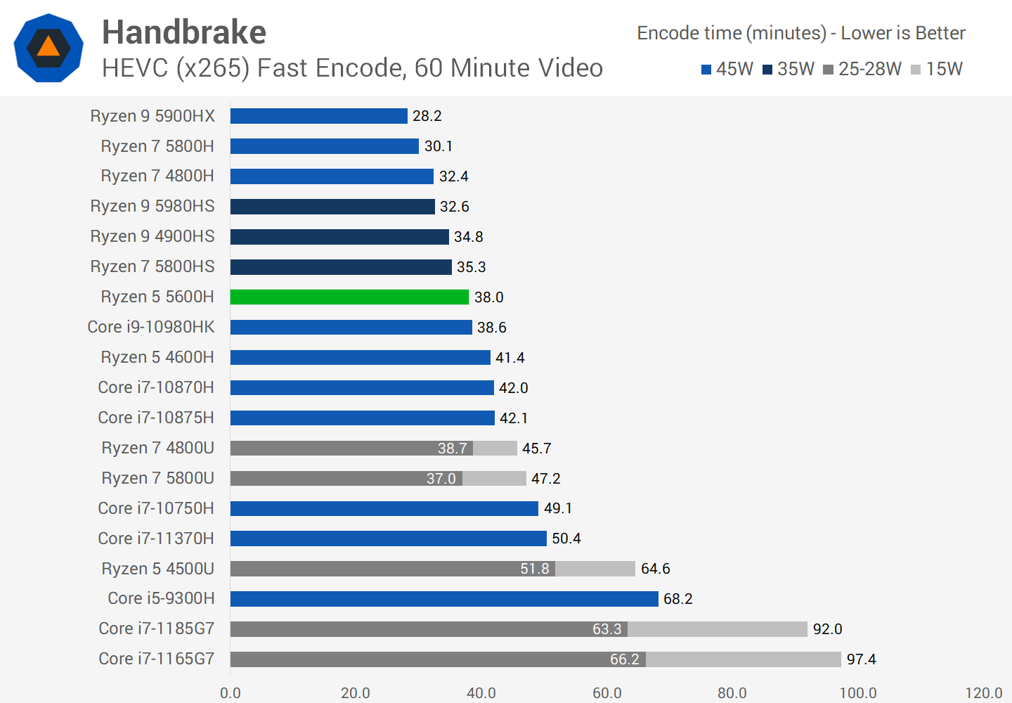 In Handbrake the Ryzen 5 5600H and Core i9-10980HK ship roughly equal efficiency, so it’s spectacular that AMD’s entry-level processor is pretty much as good on this multithreaded workload as Intel’s previous-gen flagship CPU. That is all the way down to a modest 9% efficiency enchancment shifting from the 4600H to 5600H.