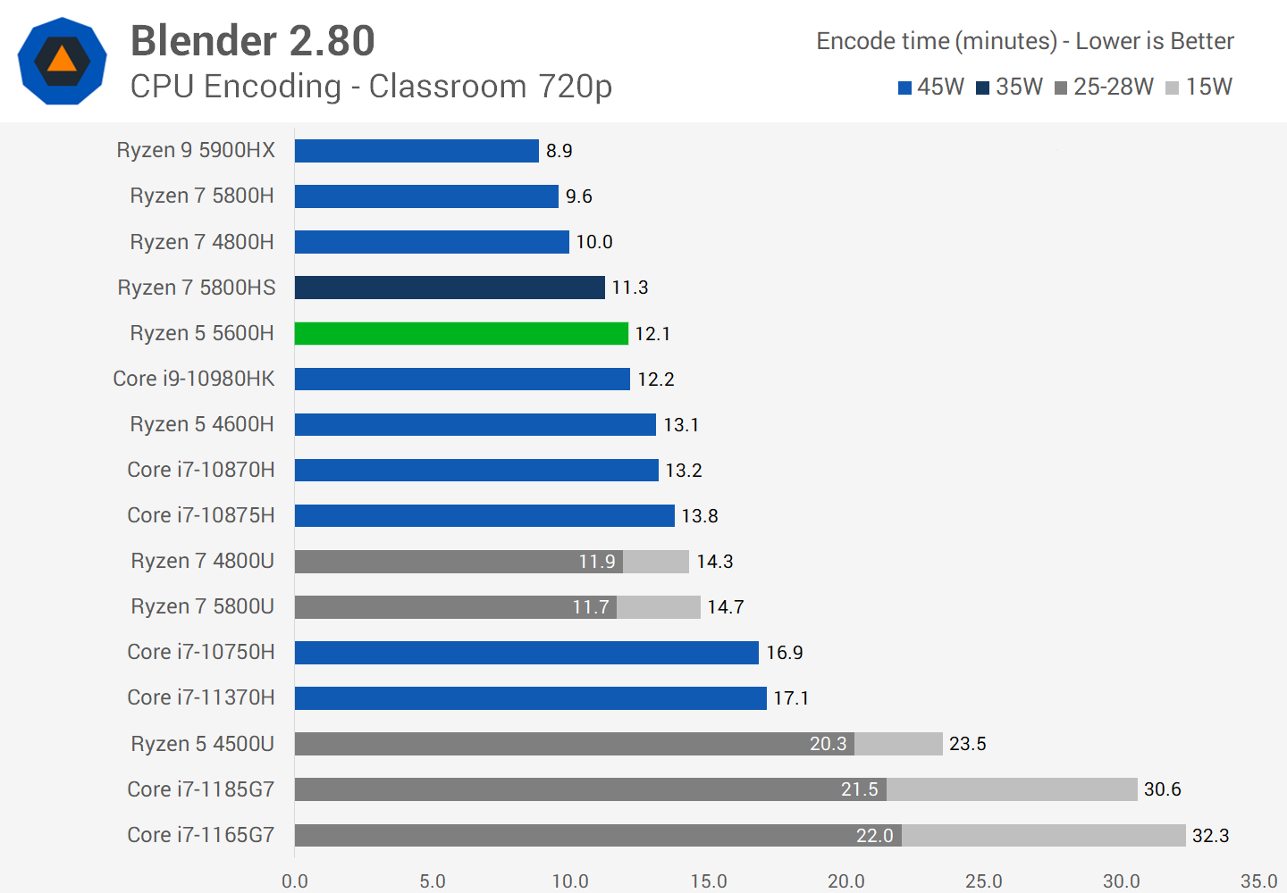 Blender delivers principally the identical outcomes as Handbrake with these new Ryzen 5000 processors: the 5600H is 8% quicker than the 4600H, and that permits it to supply equal efficiency to Intel’s 10980HK. This makes it considerably quicker than the Core i7-10750H for instance, we’re taking a look at 40% extra efficiency from the Ryzen 5 processor.