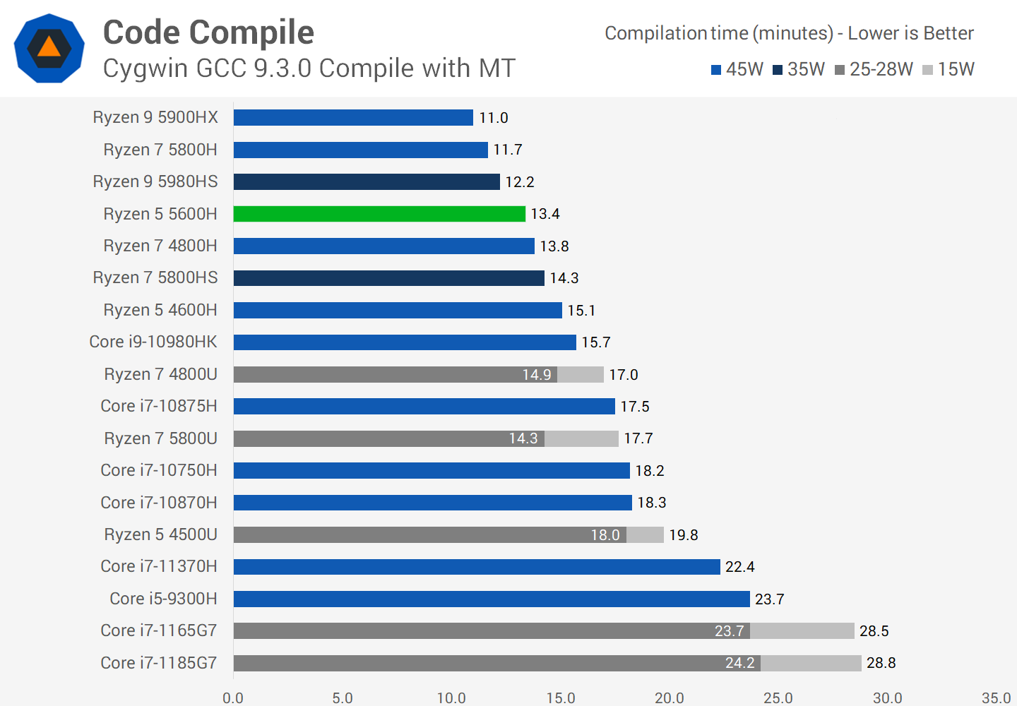 For code compilation, Ryzen 5000 processors are a wonderful alternative from the highest of the stack to the underside. The Ryzen 5 5600H delivers 13% higher efficiency on this GCC compilation than the 4600H, making it quicker than all Intel Tenth-gen designs and due to superior calmly threaded efficiency, a bit quicker than even the 4800H.