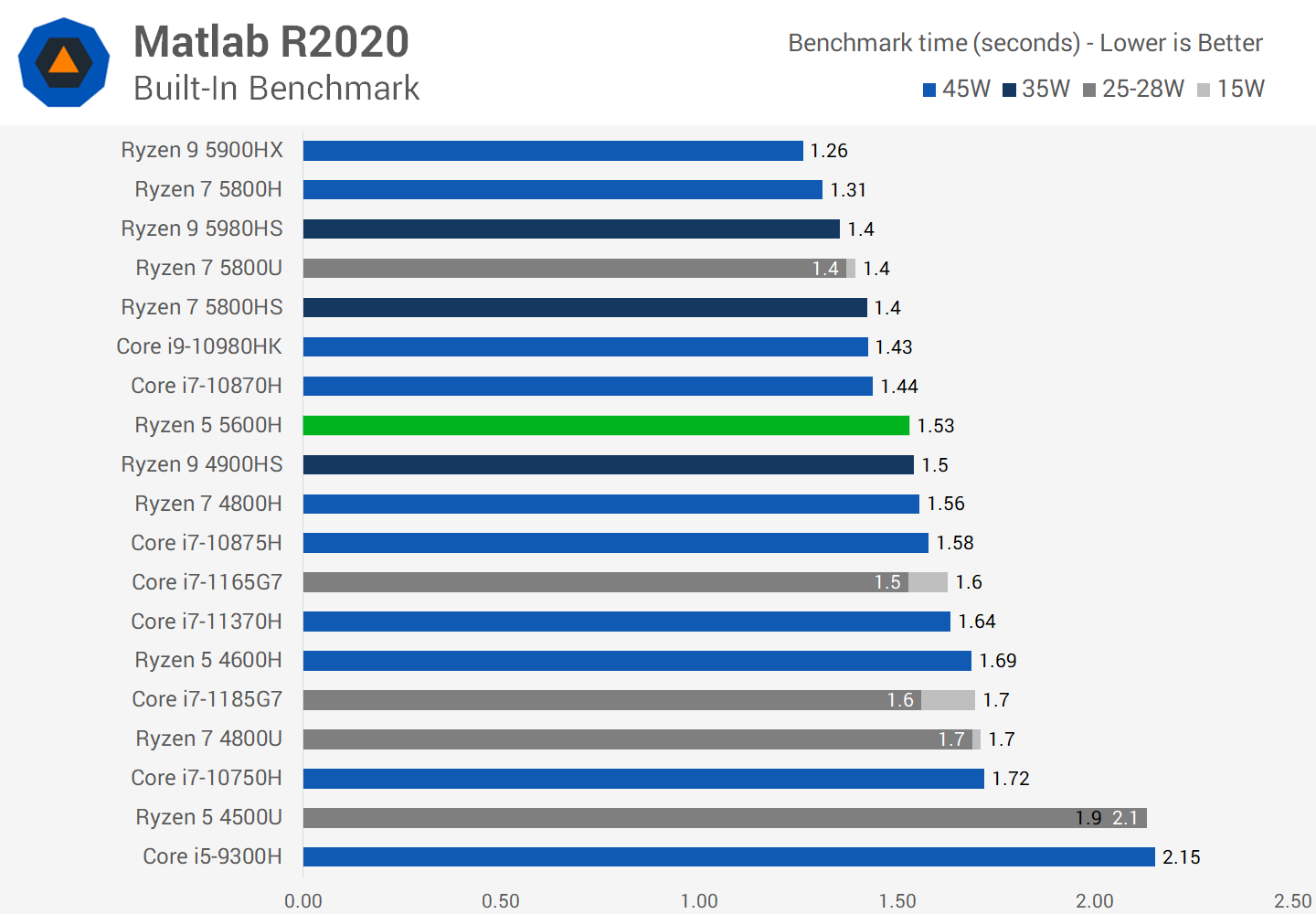 MATLAB was once the nemesis of AMD laptop computer APUs however that’s not the case with the Ryzen 5 5600H, which will increase efficiency by a good 10% on this benchmark in comparison with the 4600H. This enables it to take a seat within the vary of Intel’s 8-core Core i7 components, and quicker than the six core i7-10750H.