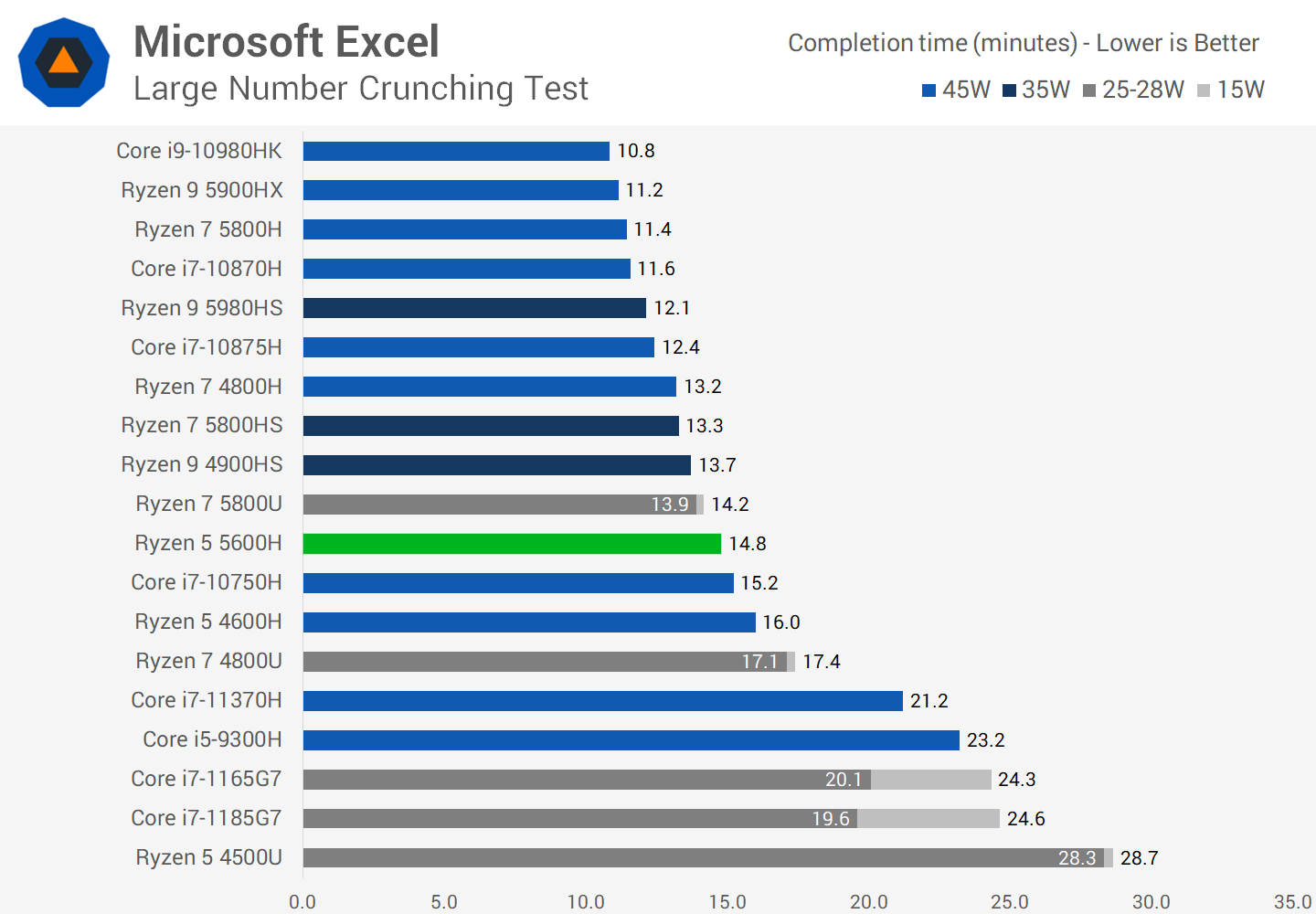 Microsoft Excel will get an 8 p.c efficiency enhance going from the R5 4600H to the R5 5600H, however in the end this is likely one of the weaker outcomes for this processor, solely matching the 10750H right here. The 5600H due to this fact finally ends up 23% slower than the 5800H on this workload.