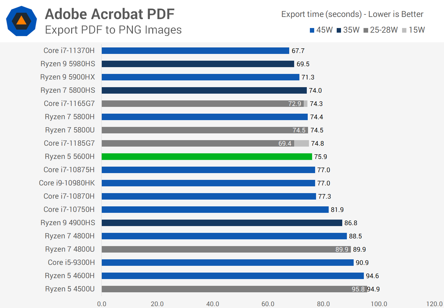 Acrobat PDF exporting is one other good single-threaded benchmark for laptops and as soon as once more the brand new Zen 3 design is massively quicker than Zen 2: the 5600H is 25% quicker than the 4600H on this workload. This enables it to barely outperform components just like the Core i7-10870H which run as much as 5 GHz, regardless of a big clock pace deficit, nevertheless the newer 11370H with its Willow Cove CPU core design is quicker once more.