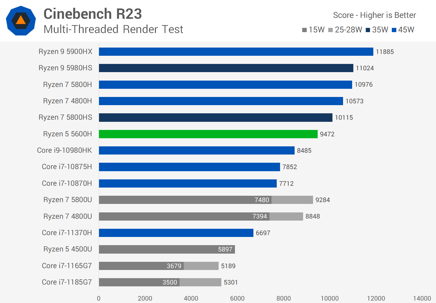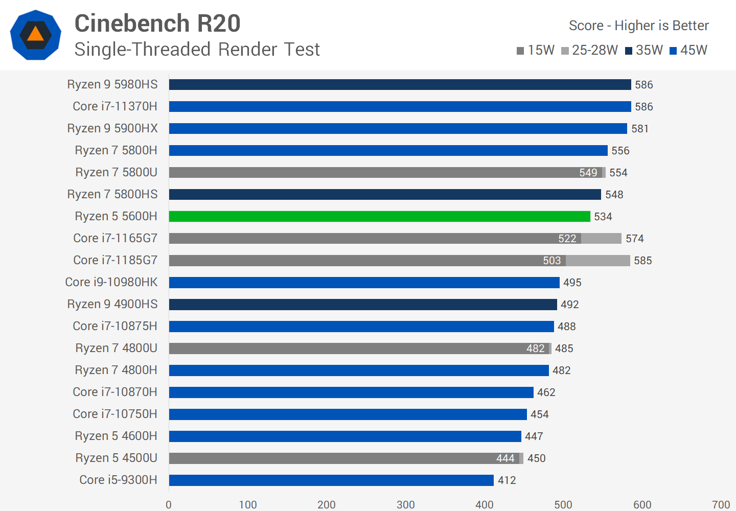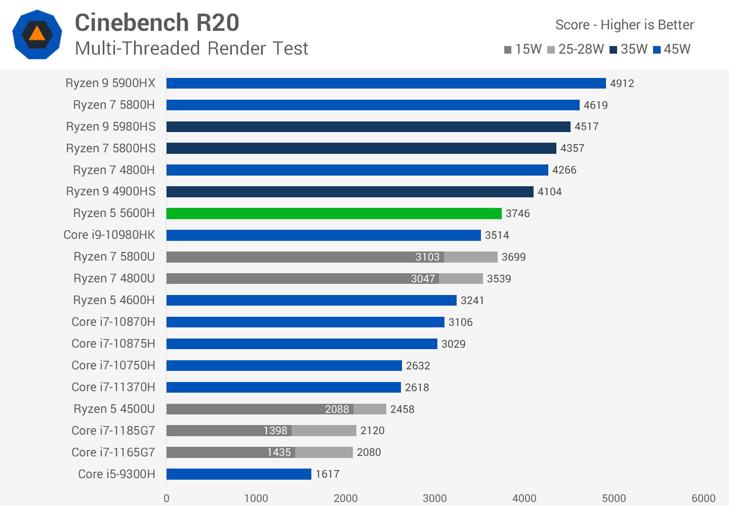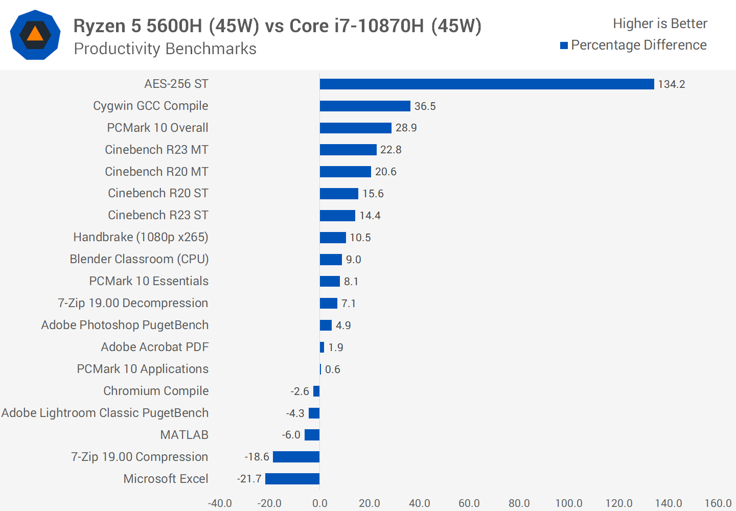 This enables the 5600H to sneak forward of the Core i9-10980HK operating at 45W, whereas beating the Core i7-10870H by 21%, and the six-core Core i7-10750H by 47%.