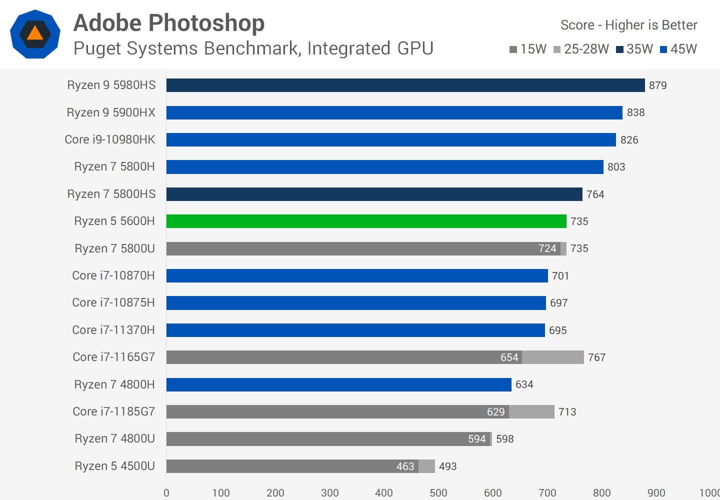With weaker single-thread efficiency, Ryzen 4000 processors weren’t properly suited to Adobe Photoshop. However that’s not the case with the 5600H. This mainstream processor is marginally quicker on this workload than Intel’s Core i7 processors and whereas it doesn’t have the identical ranges of efficiency because the Ryzen 7 vary, it’s nonetheless fairly a aggressive half for photograph enhancing on this standard device.