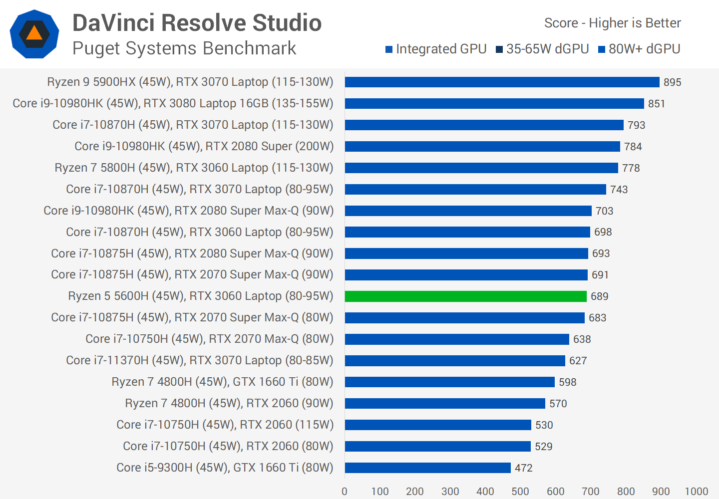 Davinci Resolve Studio is the place we start to get some GPU heavy functions. Nestled in the course of the graph is the place you’ll discover the Ryzen 5 5600H and RTX 3060 Laptop computer 80W GPU configuration, and truthfully this can be a fairly strong end result for a mainstream laptop computer.