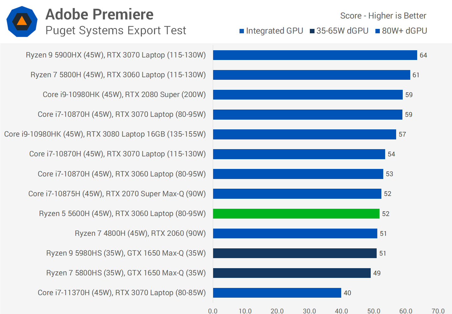 In Adobe Premiere utilizing the Puget Methods export take a look at we see fairly comparable outcomes to Davinci Resolve. The Ryzen 5 5600H is barely behind the Core i7-10870H laptop computer with the identical GPU inside so not a nasty end result given the core rely discrepancy, and this can be a workload that makes use of {hardware} accelerated video encoding.