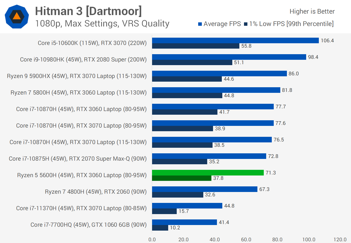 The primary is that in CPU restricted titles, the Ryzen 5 5600H performs okay however not amazingly. In Hitman 3’s Dartmoor benchmark for instance, the 5600H with the RTX 3060 is a bit bit quicker than a final era 4800H system with the RTX 2060, and about 8 p.c slower than a Core i7-10870H configuration.
