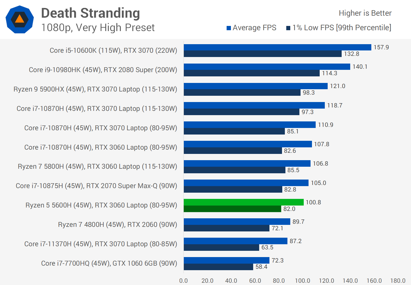 Right here’s one other instance of comparable habits in Demise Stranding, which can also be fairly CPU demanding at 1080p. Once more, 5600H with the RTX 2060 is a bit quicker than our last-gen 4800H plus 2060 configuration, however about 6% behind the Core i7-10870H that makes use of the identical GPU configuration.