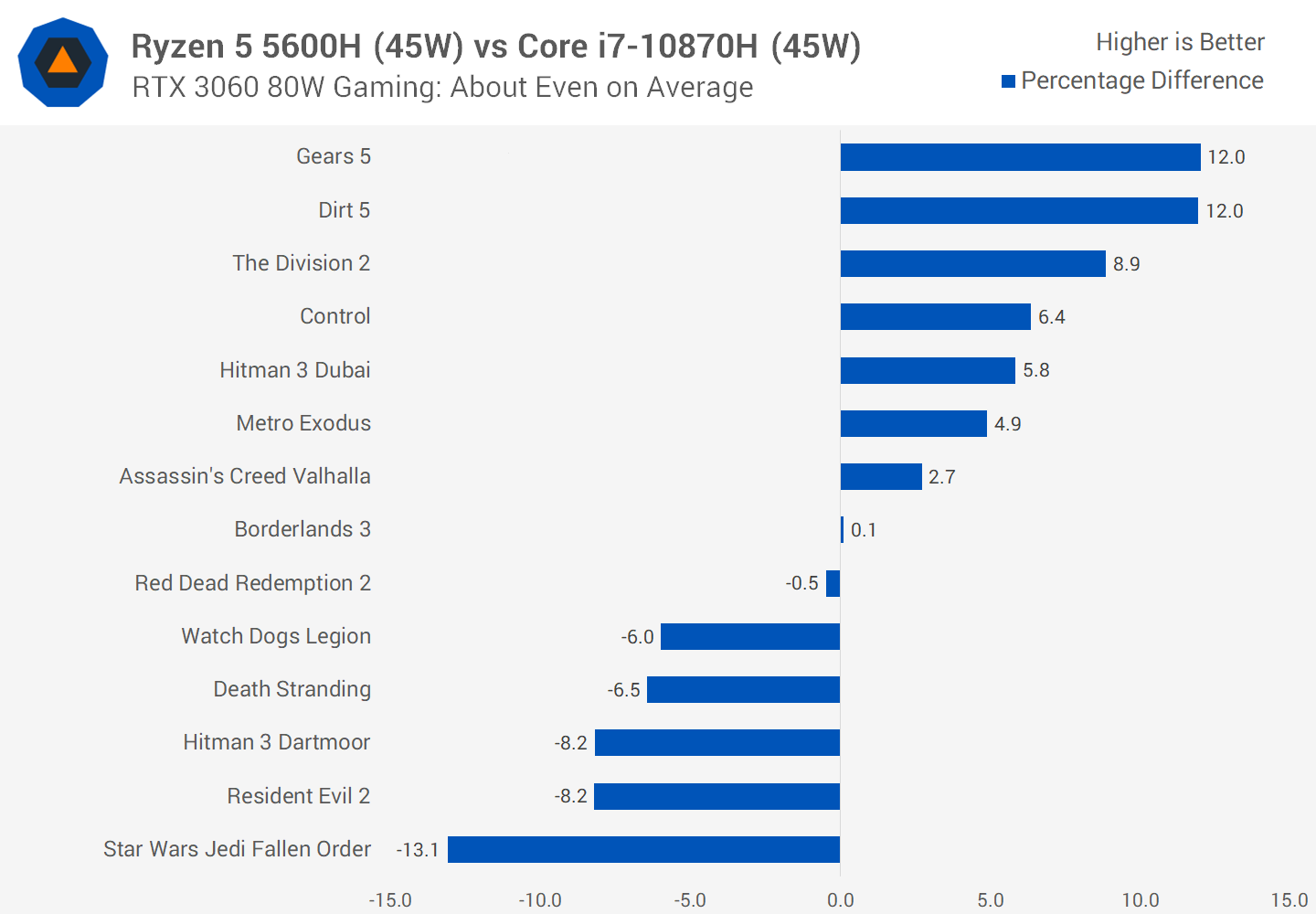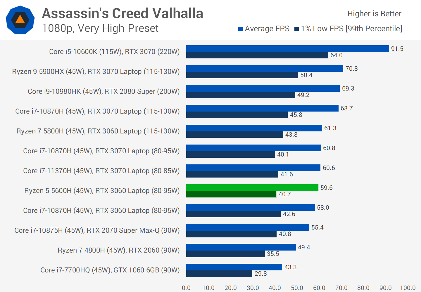 The second type of efficiency outcomes we noticed have been equal efficiency when evaluating the Ryzen 5 5600H and Core i7-10870H. This appears to happen in some titles which are CPU demanding, and a few titles which are heavy on the GPU greater than CPU. One instance that we’re taking a look at right here is Murderer’s Creed Valhalla, the 5600H does a good job on this title.
