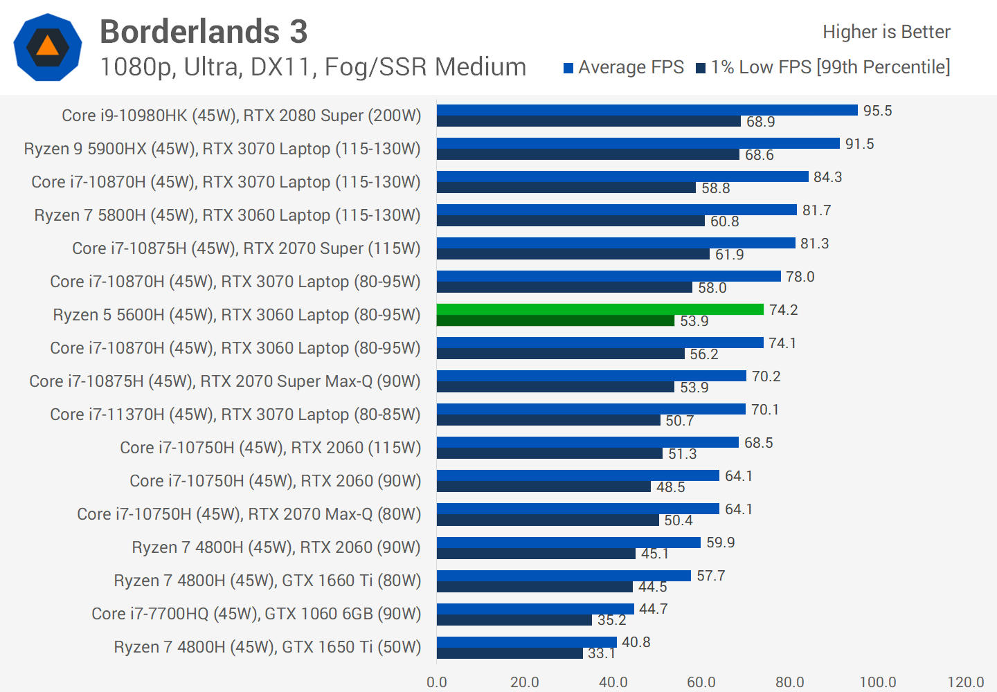 One other instance is Borderlands 3, a title we usually affiliate with being CPU demanding, but the Ryzen 5 5600H holds its personal in opposition to the Core i7-10870H when each techniques are configured with the identical GPU. In order that’s a promising end result provided that Ryzen 5 laptops are usually cheaper than Core i7 laptops, particularly these with the 10870H inside.
