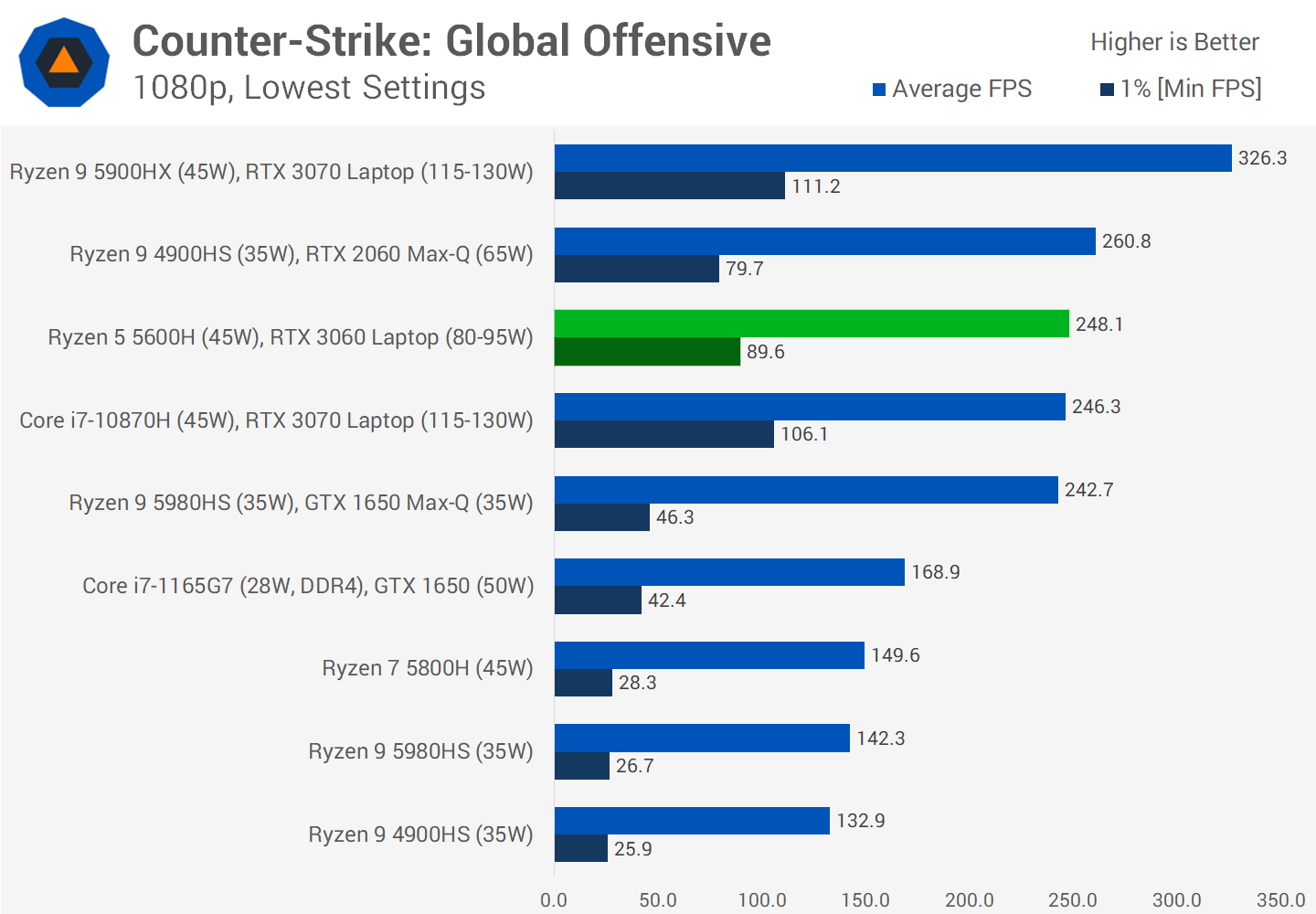 CS Go operating Low settings is a pleasant third instance. It doesn’t matter what GPU you’ve gotten when taking part in this title as you’ll possible be CPU sure and as soon as once more the Ryzen 5 5600H performs fairly properly.