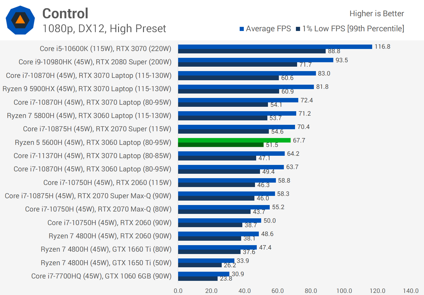The third state of affairs have been a lot of conditions the place the Ryzen 5 5600H was quicker than the Core i7-10870H operating the identical RTX 3060 GPU. At occasions, like in Management, plainly the effectivity of the 5600H involves play with Nvidia’s Dynamic Enhance, permitting the RTX 3060 to extra steadily hit the 95W ceiling on this configuration, with the Ryzen CPU operating at decreased energy. As compared the 10870H isn’t as able to reducing energy ranges with out dropping efficiency, and so the GPU sits extra round 85W.