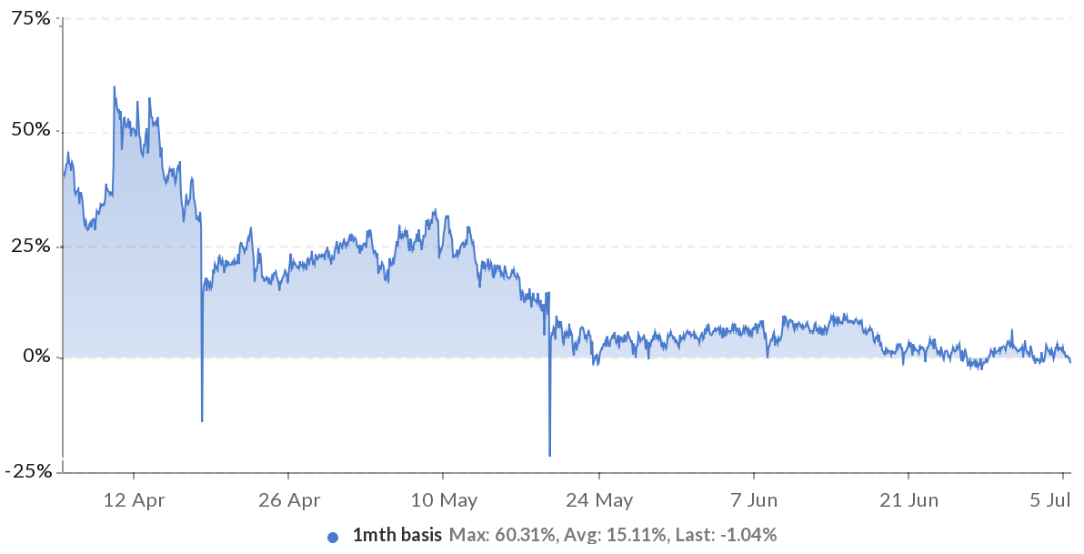 In keeping with the chart above, the one-month futures contract has been unable to maintain an annualized premium above 5% since June 18. There have even been some intervals of backwardation, together with the newest one on July 5.