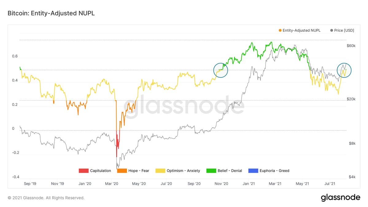 In October 2020, the Bitcoin NUPL moved upward of zero as its warmth map modified colours from yellow to inexperienced after efficiently bouncing off the purple zone in March earlier that 12 months.