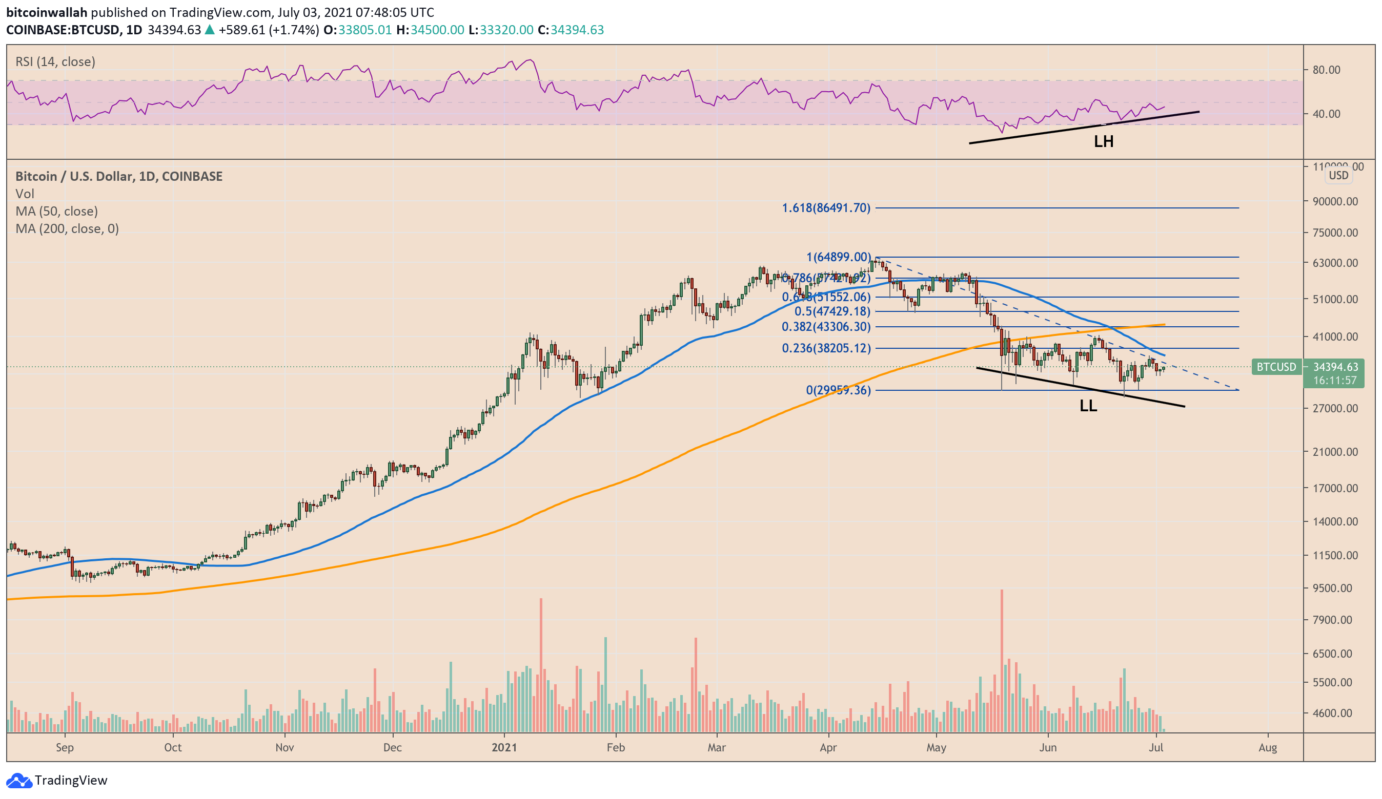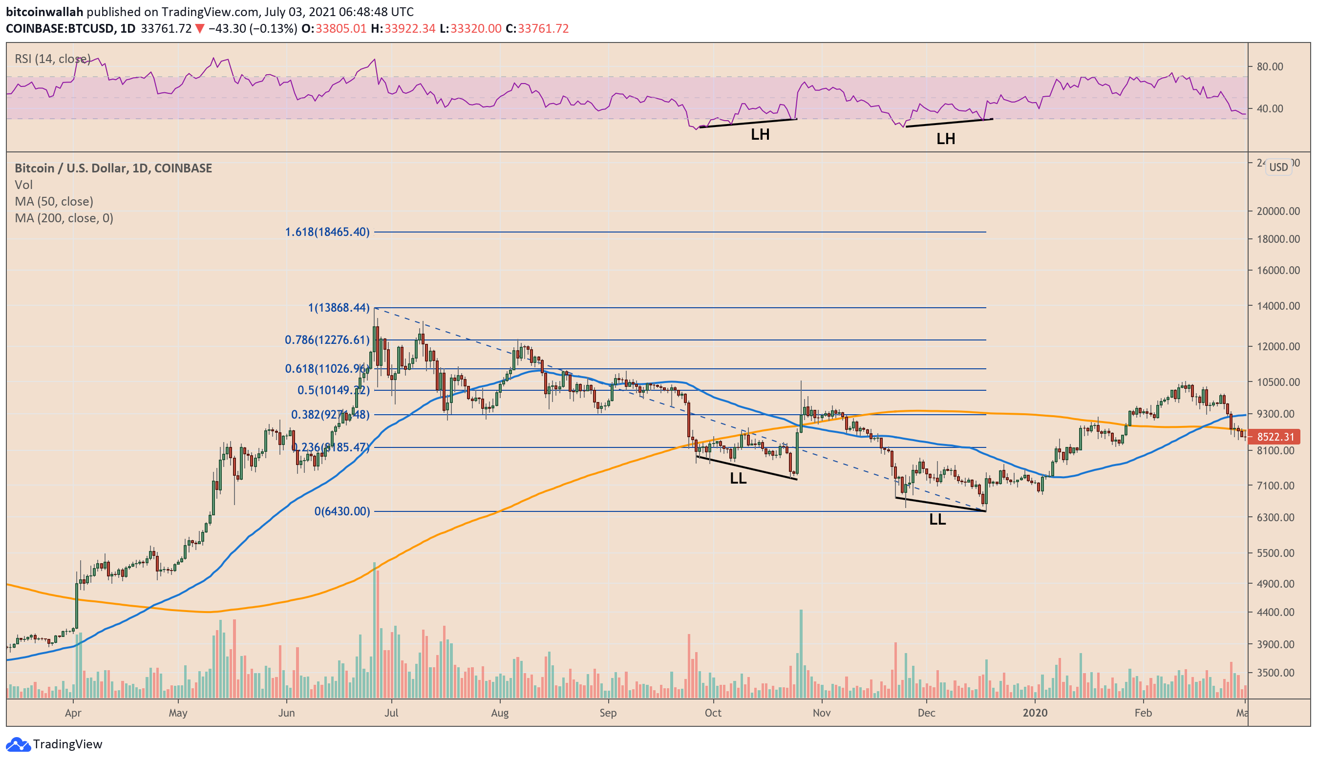The 2019 fractal additionally illustrated no less than two bullish divergence situations, whereby the Bitcoin worth fashioned decrease lows whereas its day by day relative energy indicator, a price-momentum oscillator, made decrease highs. It hinted weak spot within the prevailing bearish momentum. And because it turned out, the worth soared later.