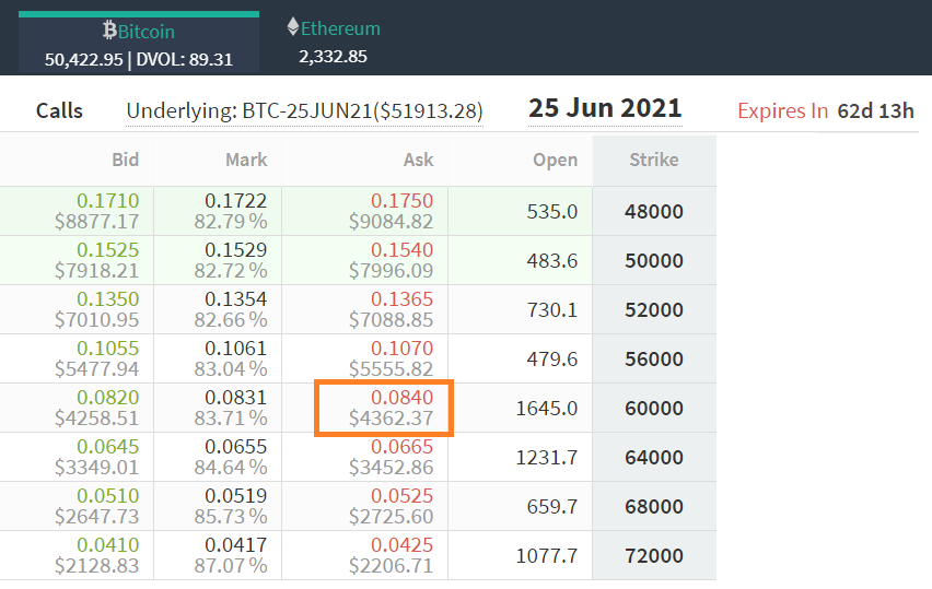 For instance, shopping for upside safety utilizing a $60,000 name choice for June 25 at present prices $4,362. This implies the worth must rise to $64,362 for its purchaser to revenue — a 19.7% enhance from $50,423 in two months.