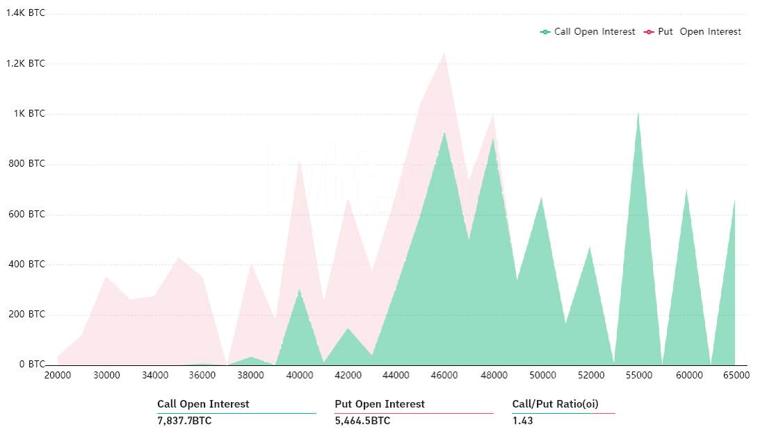 Bears appear to have been taken without warning as a result of 73% of the protecting put choices have been positioned beneath $44,000. Consequently, the instrument’s open curiosity could be diminished to $65 million if the Bitcoin expiry takes place above that threshold, and this could give bears a $41 million benefit.