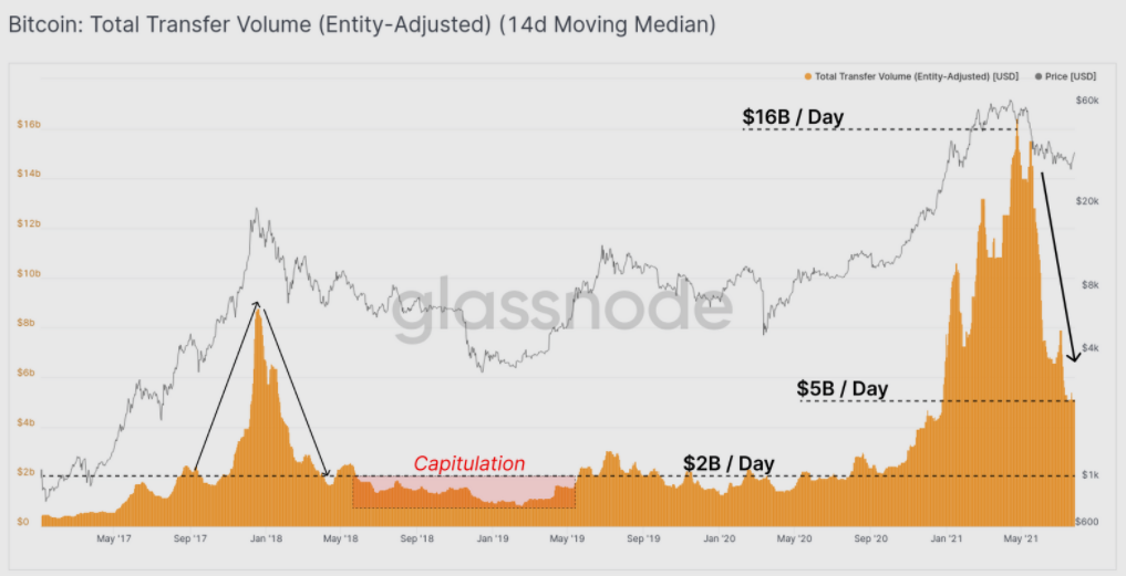 Glassnode additionally pointed to Bitcoin on-chain exercise and highlighted that “in direct distinction to the volatility in spot and derivatives markets, the transaction quantity and on-chain exercise stays extraordinarily quiet.”
