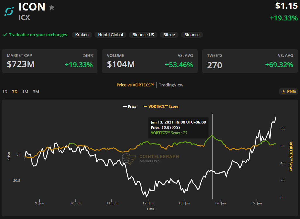 VORTECS™ knowledge from Cointelegraph Markets Professional started to detect a bullish outlook for ICX on June 13, previous to the latest worth rise.