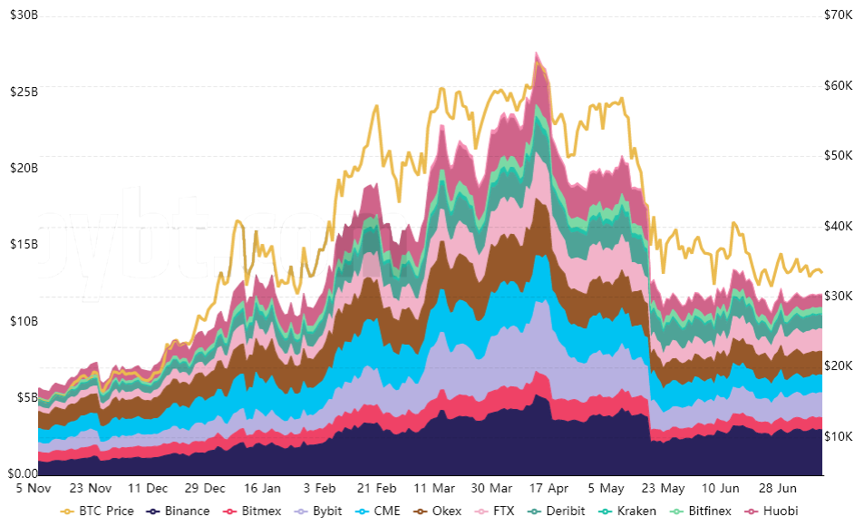 Each futures contract wants a purchaser and vendor of the very same dimension, and the open curiosity measures the mixture notional in U.S. {dollars}. Which means as Bitcoin value strikes down, so does the indicator.