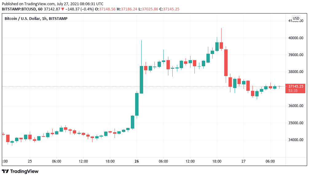 Knowledge from Cointelegraph Markets Professional and TradingView confirmed BTC/USD hovering close to $37,000, round 8.8% under the height of Monday’s beneficial properties.