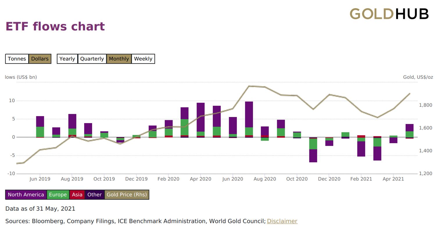 Sturdy demand for gold ETFs additionally contributed to the rise of its spot costs. Consequently, the XAU/USD change fee jumped 7.6% in Might to $1,912.785 an oz.