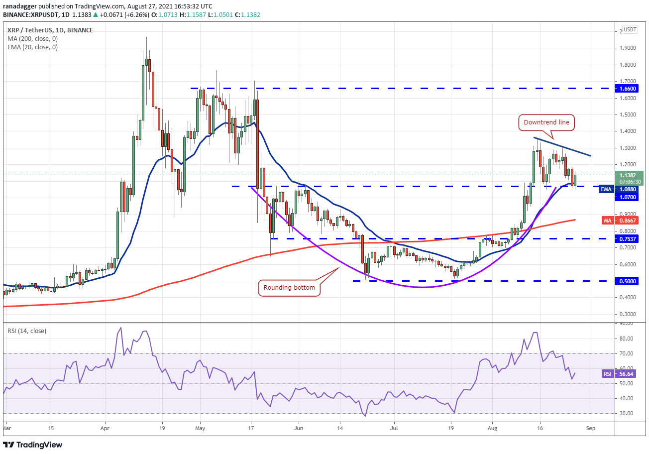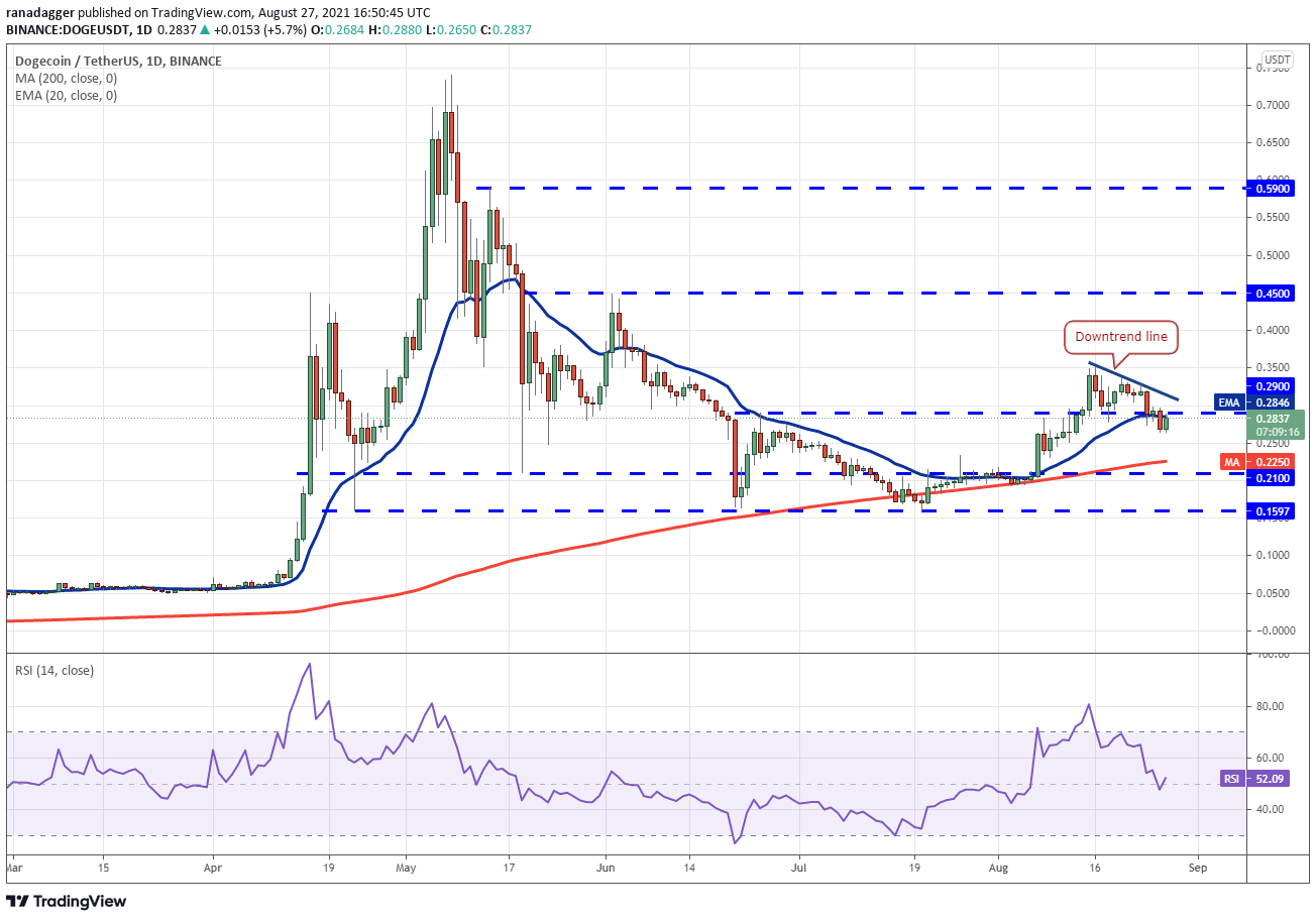 Dogecoin (DOGE) broke under the 20-day EMA ($0.28) on Aug. 27, indicating that offer exceeds demand. The bulls are presently trying to push the value again above the overhead resistance at $0.29.