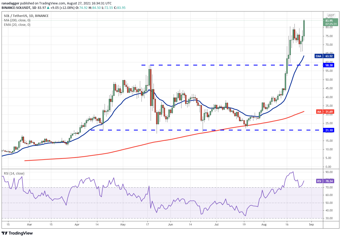The bulls have pushed the value above the all-time excessive at $82 as we speak. If consumers maintain the value above $82, the SOL/USDT pair might begin its journey towards the subsequent psychological barrier at $100.