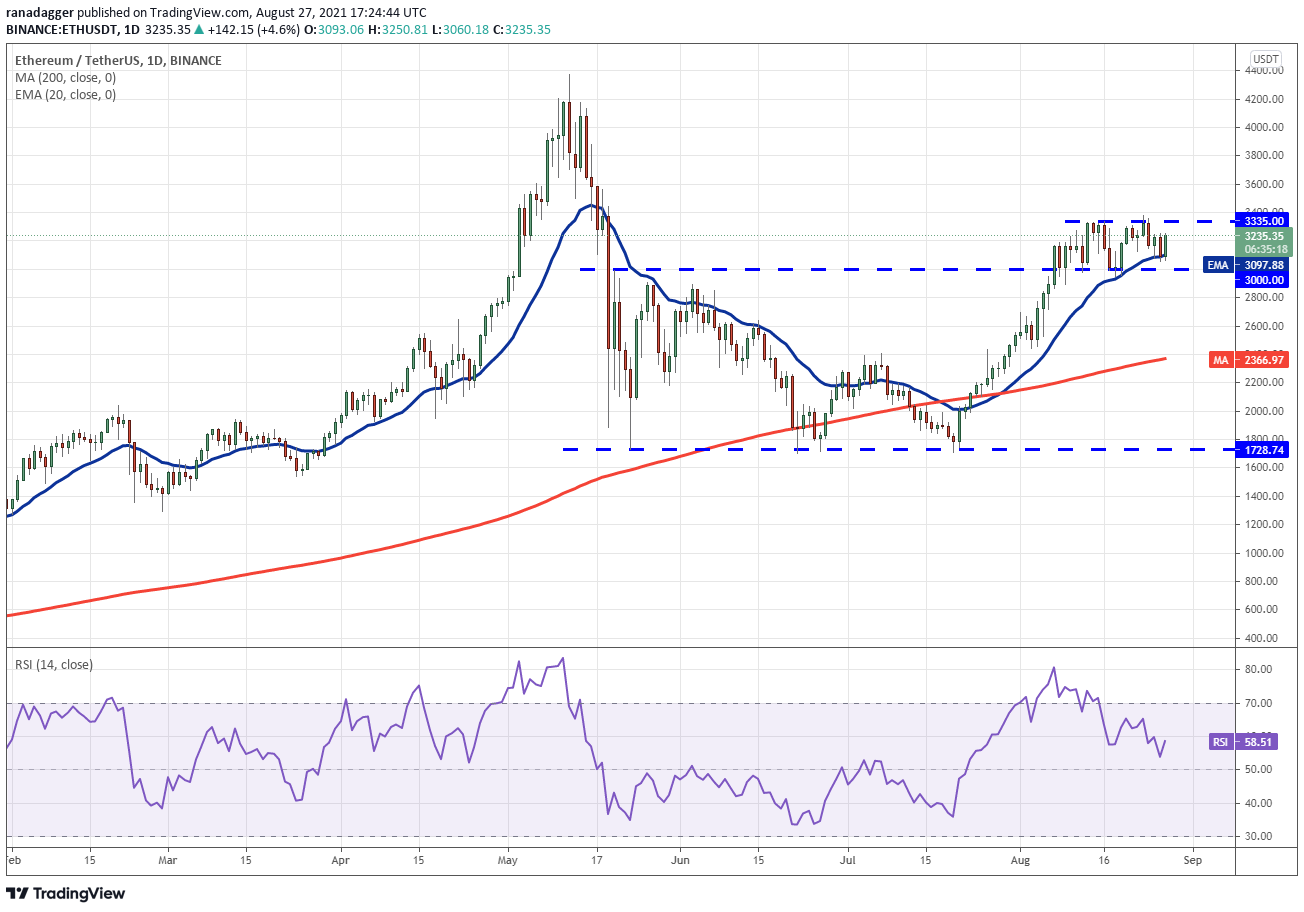 The worth has rebounded off the 20-day EMA as we speak and the bulls will now try to push the value above $3,335. If that occurs, it can recommend that bulls accrued the ETH/USDT pair contained in the vary. The pair might then rally to $3,670 and later to $4,000.