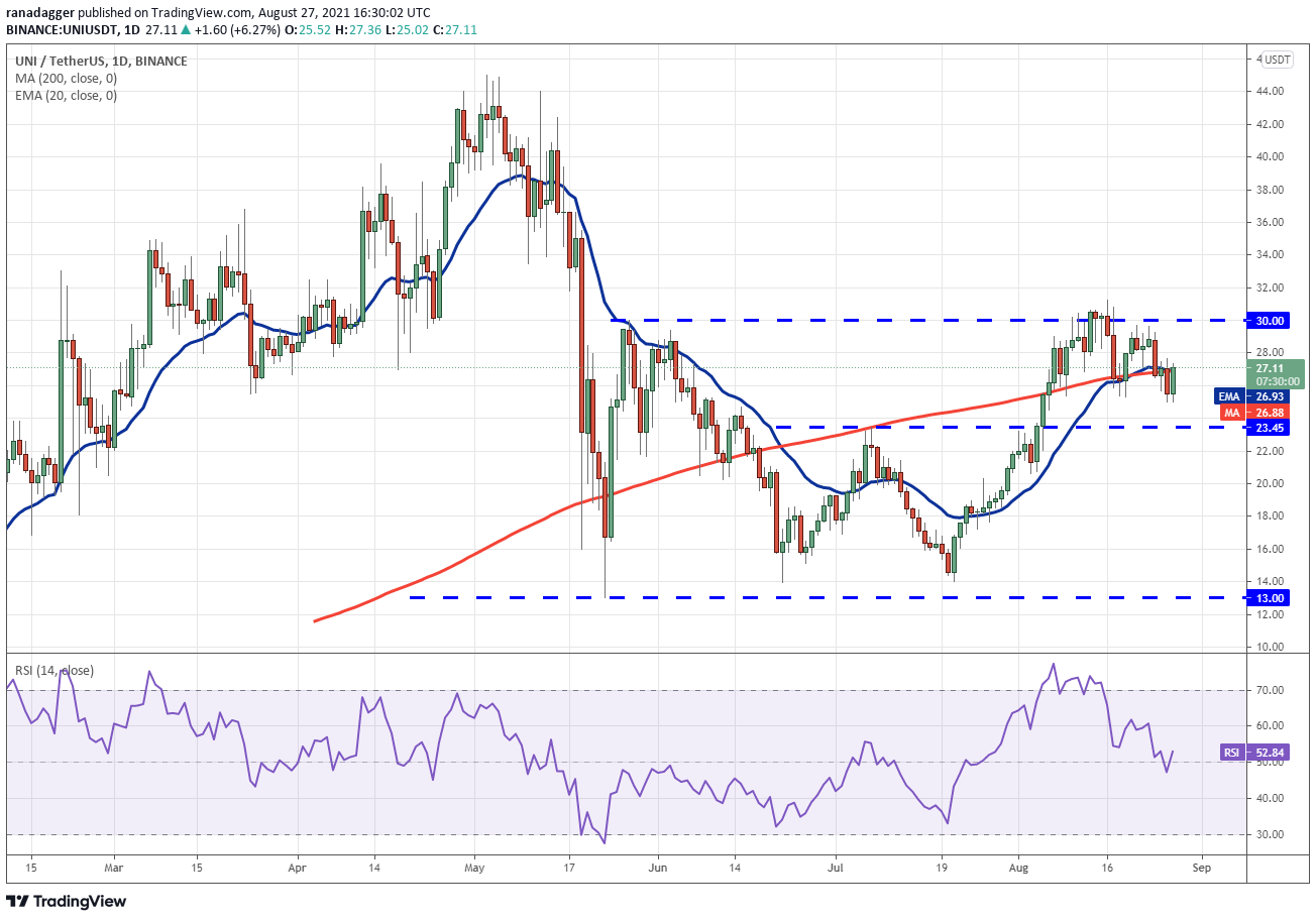 Uniswap (UNI) broke under the transferring averages on Aug. 24, indicating weak point. The bulls tried to push the value again above the transferring averages on Aug. 25 and 26 however they may not maintain the upper ranges.