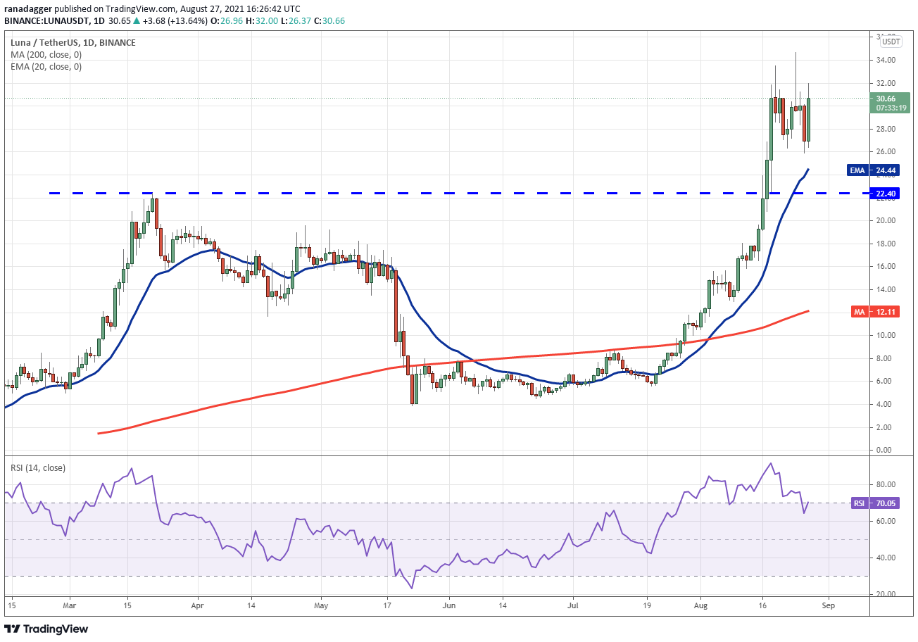 Terra protocol’s LUNA token has been consolidating between $26 and $32 for the previous few days. Though bulls pushed the value above $32 on Aug. 19 and 24, they may not maintain the upper ranges.