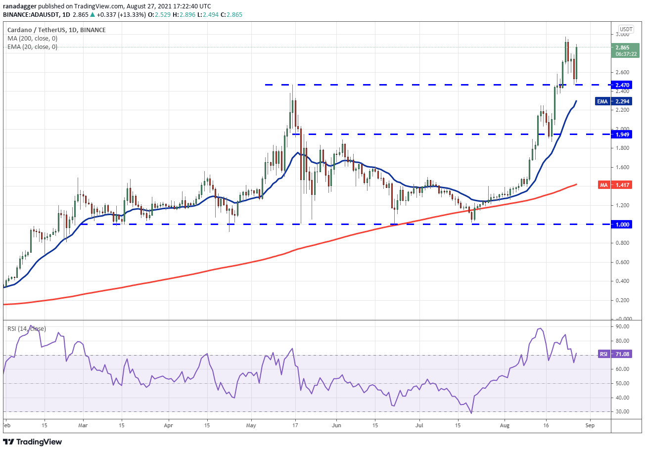 Usually, the breakout from a crucial degree is retested as seen in Cardano (ADA). The worth dropped from an all-time excessive at $2.97 on Aug. 23 to the breakout degree at $2.47 on Aug. 26.