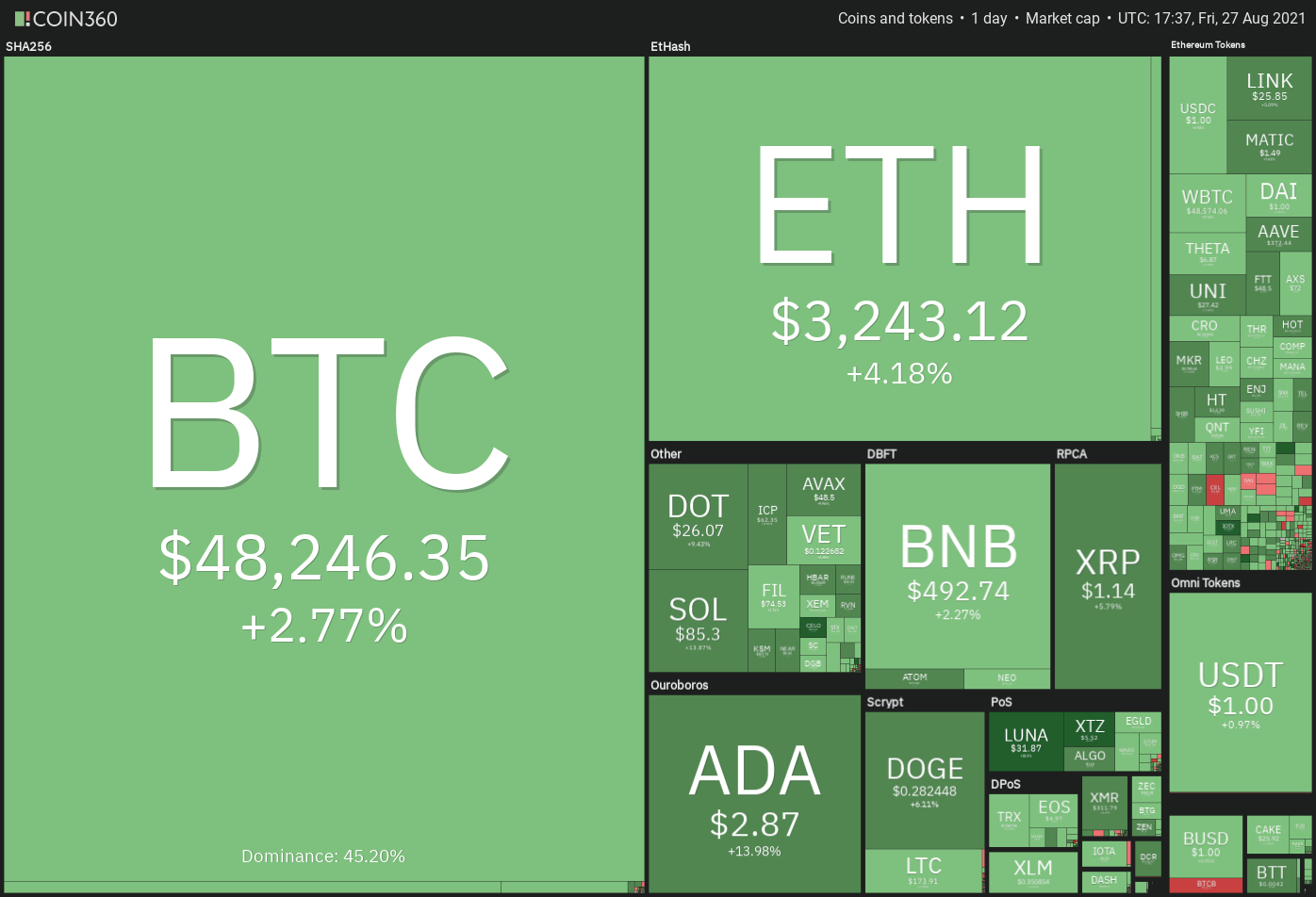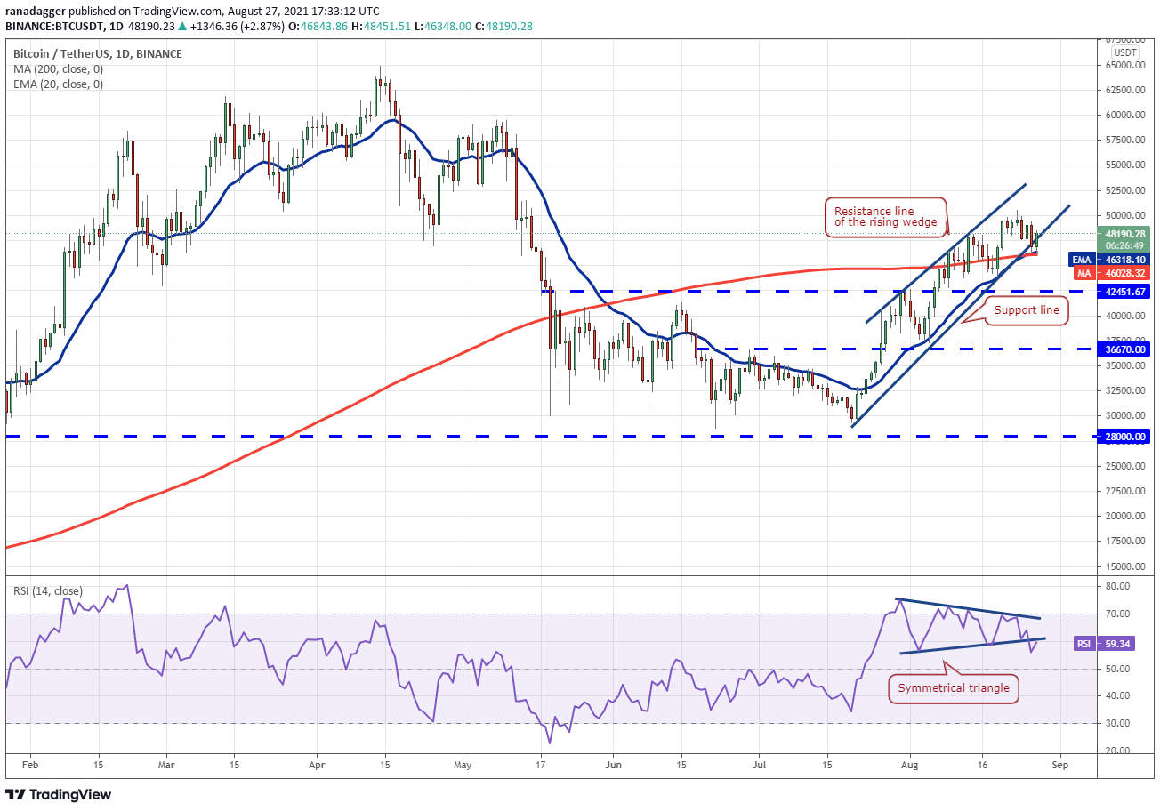 Robust resistance close to the $50,000 mark might have attracted profit-booking from the short-term merchants on Aug. 26. That pulled Bitcoin under the help line of the rising wedge sample however the bears haven’t been in a position to capitalize on this transfer and sink the value under the transferring averages.