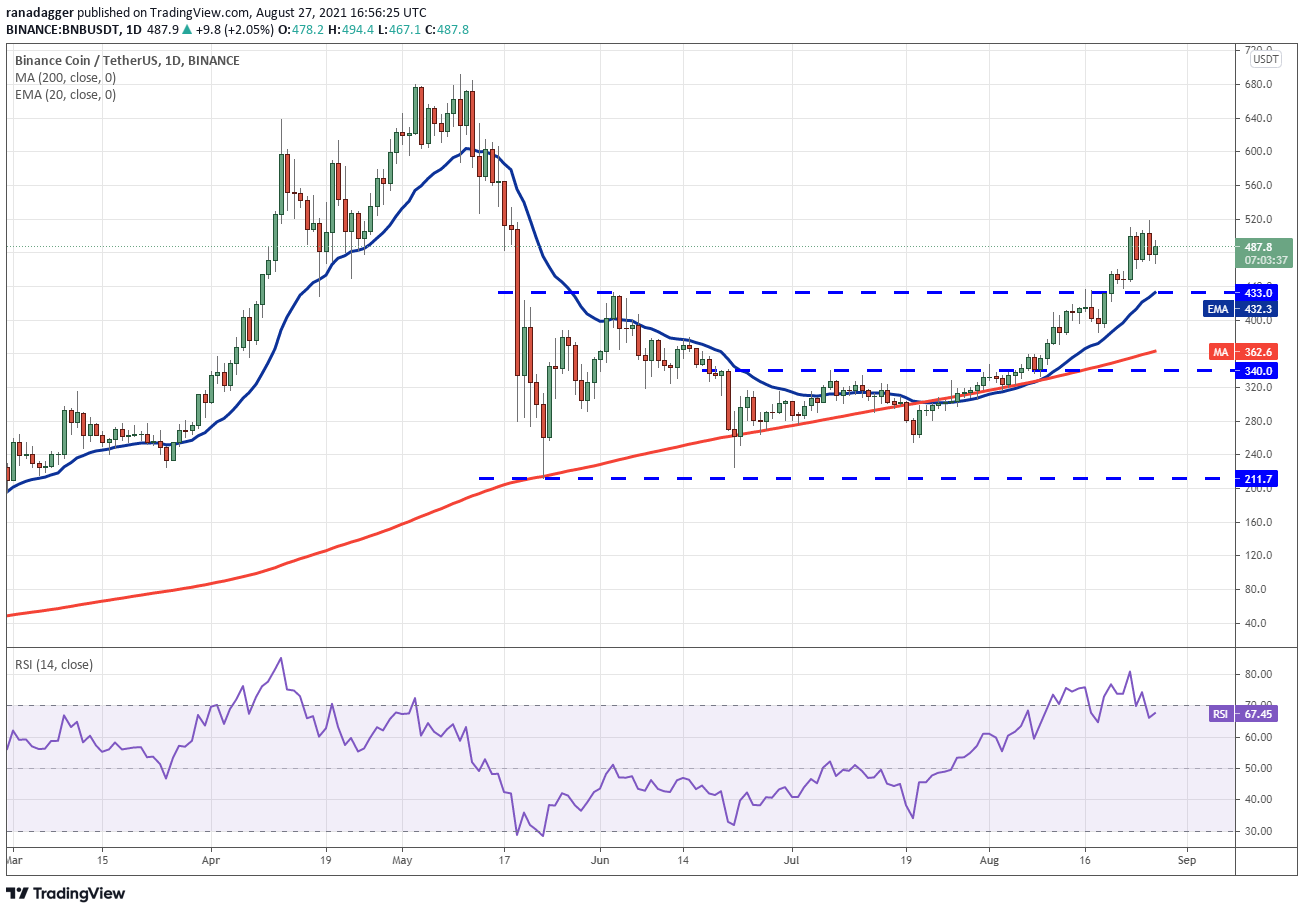 Binance Coin’s (BNB) intraday excessive on Might 19 was $516.50 and that degree is prone to act as a stiff resistance. The bulls pushed the value above this resistance on Aug. 26 however couldn’t maintain the altcoin above it.
