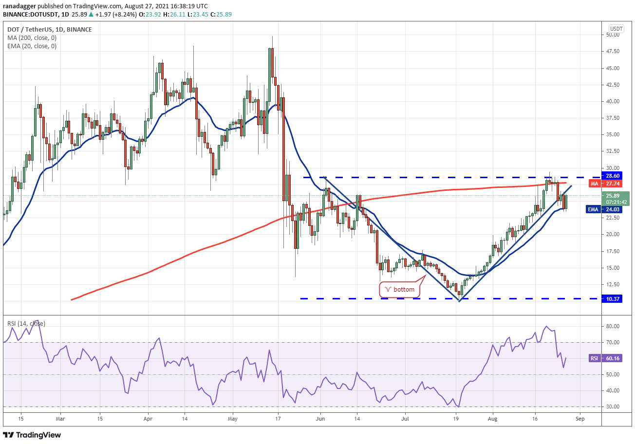 Polkadot (DOT) turned down from the overhead resistance at $28.60 and corrected to the 20-day EMA ($24.03). The sturdy rebound off this degree exhibits that bulls are accumulating on dips.