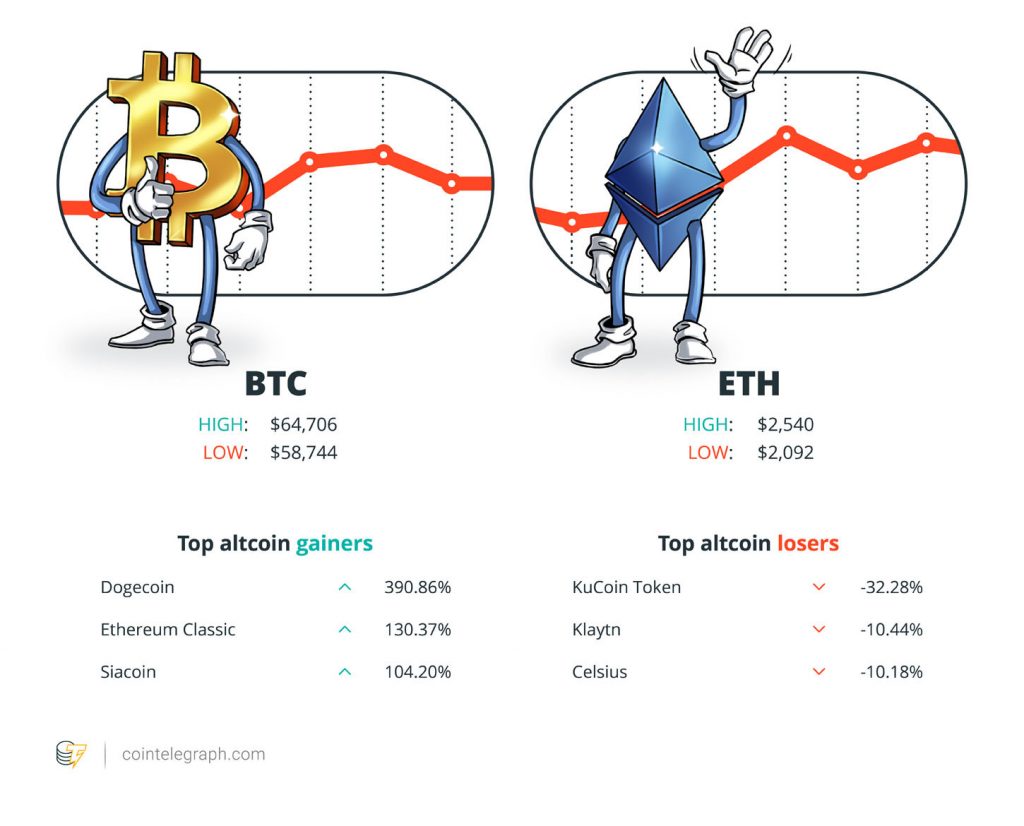 Among the many largest 100 cryptocurrencies, the highest three altcoin gainers of the week are Dogecoin, Ethereum Traditional and Siacoin. The highest three altcoin losers of the week are KuCoin Token, Klaytn and Celsius.