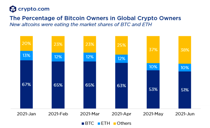 The outcomes present that Bitcoin (BTC) and the second-most valued cryptocurrency, Ether (ETH), have been dropping their market shares by way of the composition of crypto house owners, whereas the variety of customers holding different digital belongings has been steadily rising.