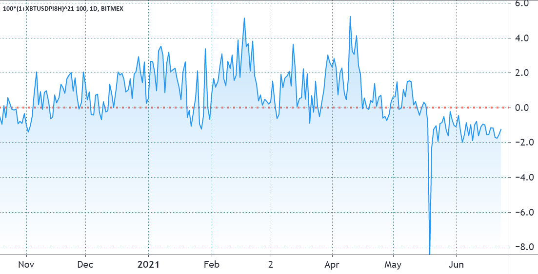 The Bitcoin (BTC) futures funding charge has been damaging since Could 18 (37 days), and this example signifies consumers’ lack of urge for food for leverage longs.