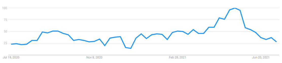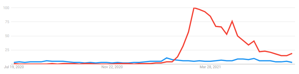 Each charts present spikes in search curiosity that line up with value will increase in associated DeFi and NFT tokens, and so they additionally handle to seize the diminishing curiosity seen as costs fell in June and July.